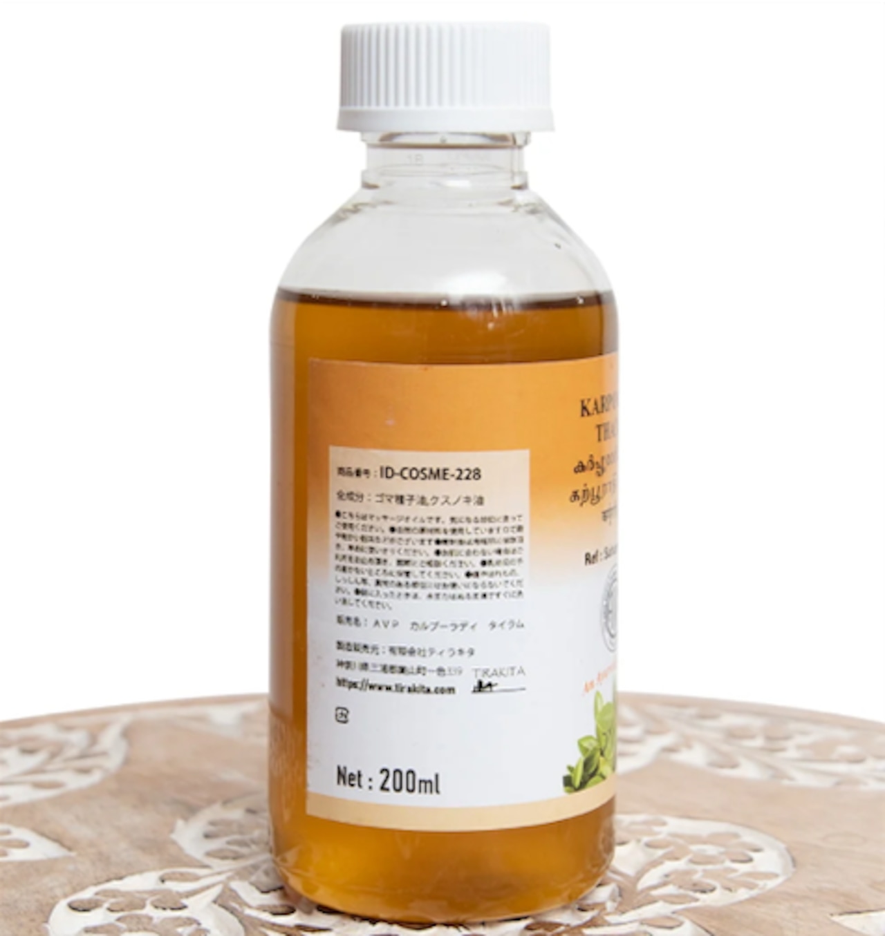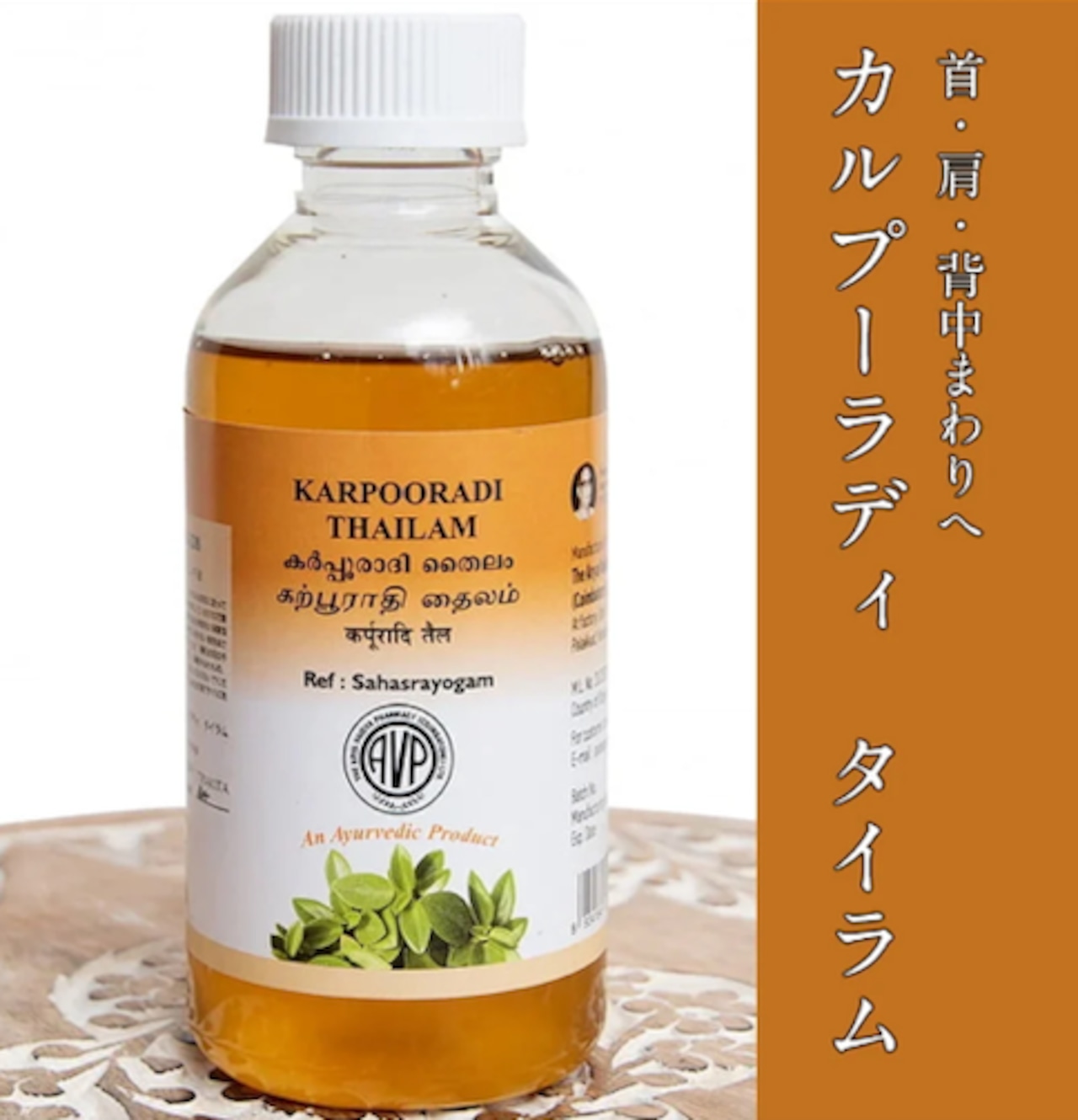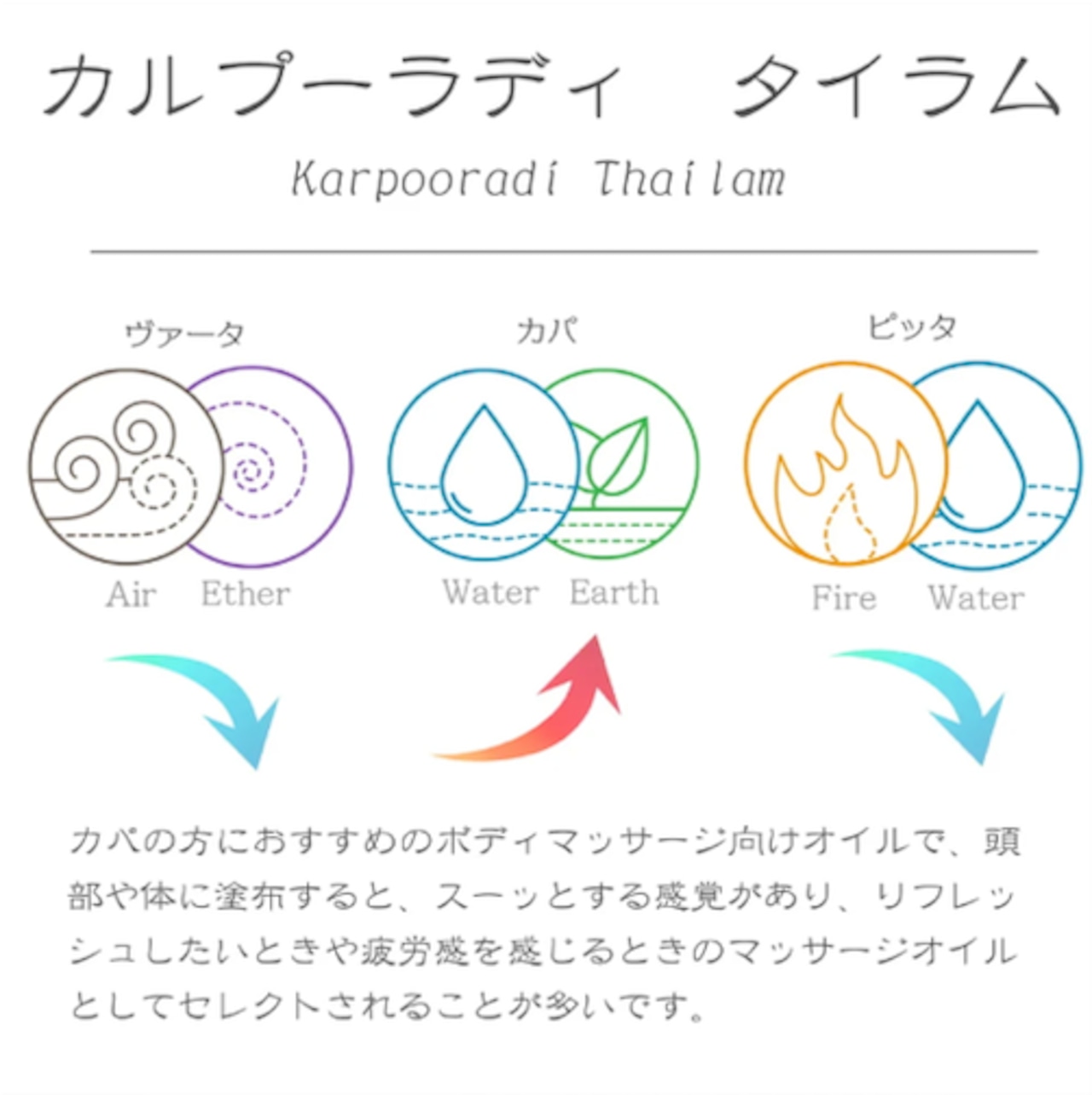 こちらはアーユルヴェーダの本場、南インドにて調製された、アーユルヴェーダオイルです。カルプーラディ タイラムはすべてのドーシャを落ち着かせるオイルですが、特にカパ用ボディマッサージ向けオイルとしての特性があります。